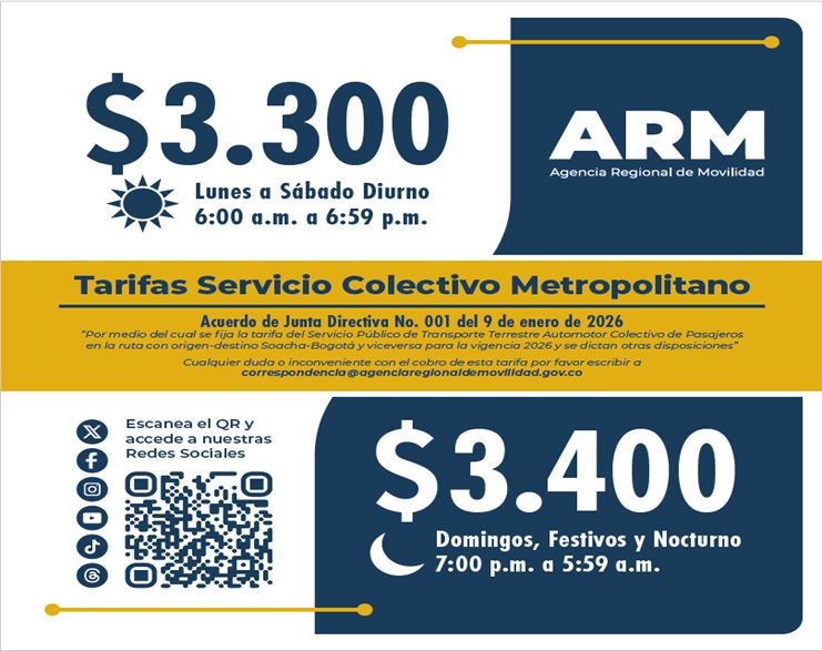 Frente a las empresas de operación nacional, la ARM estableció las nuevas tarifas a través del acuerdo de junta directiva N.º 001 (9 de enero de 2026) “Por medio del cual se fija la tarifa del Servicio Público de Transporte Terrestre Automotor Colectivo de Pasajeros en la ruta con origen-destino Soacha-Bogotá y viceversa para la vigencia 2026 y se dictan otras disposiciones”.