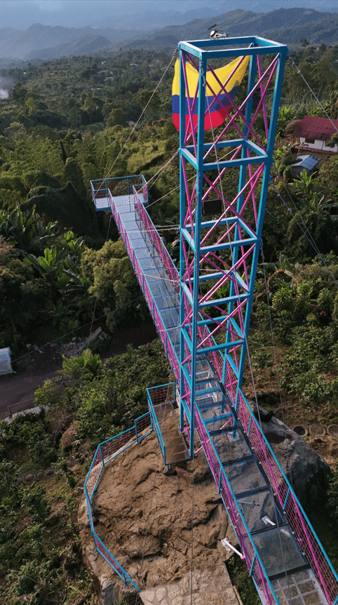 Su estructura de 24 metros de longitud permite a los visitantes caminar sobre una superficie completamente transparente que ofrece una vista directa del paisaje natural de Viotá, en Cundinamarca.