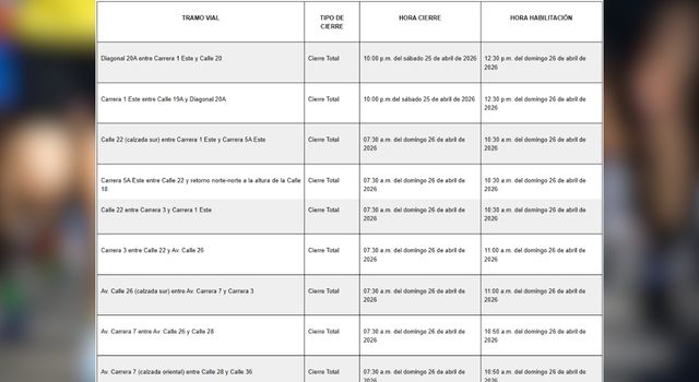 Las restricciones comenzarán desde la noche del sábado y se extenderán hasta el mediodía del domingo, afectando varias vías principales. Entre los puntos con mayores cambios están la calle 22, la carrera 7 y la avenida calle 26, corredores clave para la movilidad en la capital.