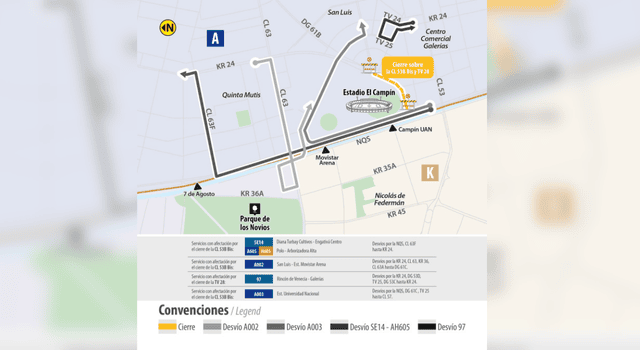 Seis rutas TransMiZonales tendrán desvíos por cierres viales en inmediaciones de El Campín.